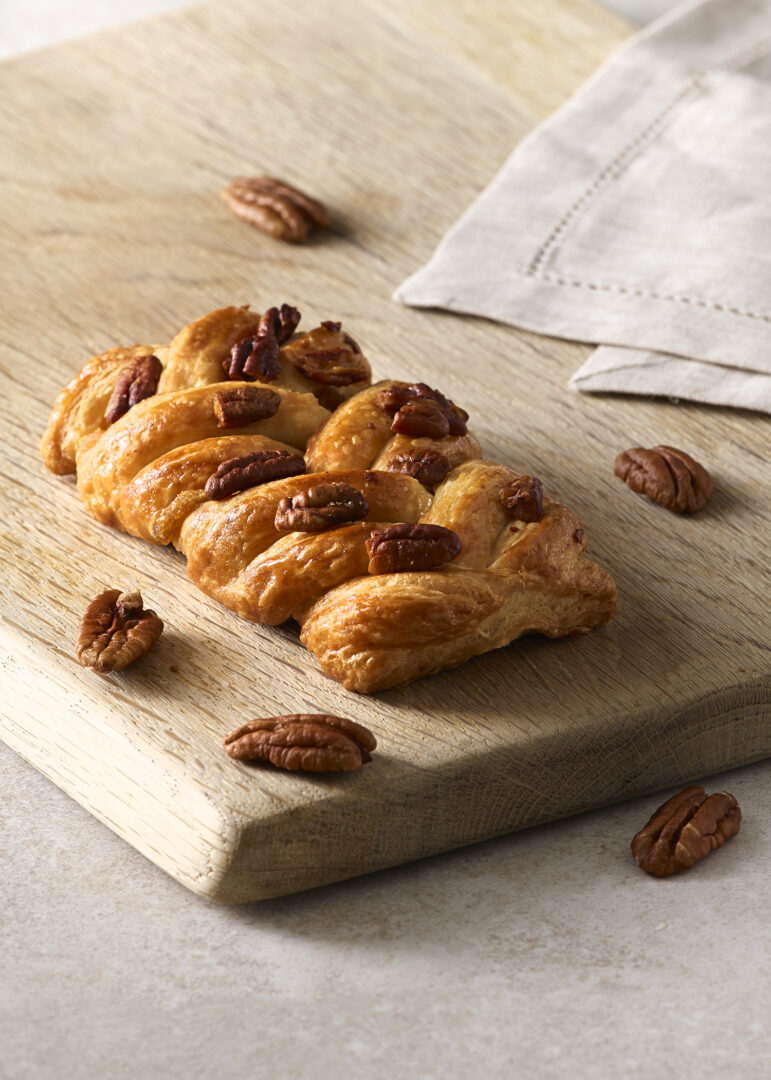 Maple syrup filling in a plait of lightly, flaky Danish pastry, topped with toasted with pecan nuts